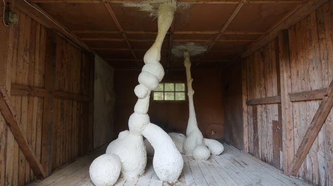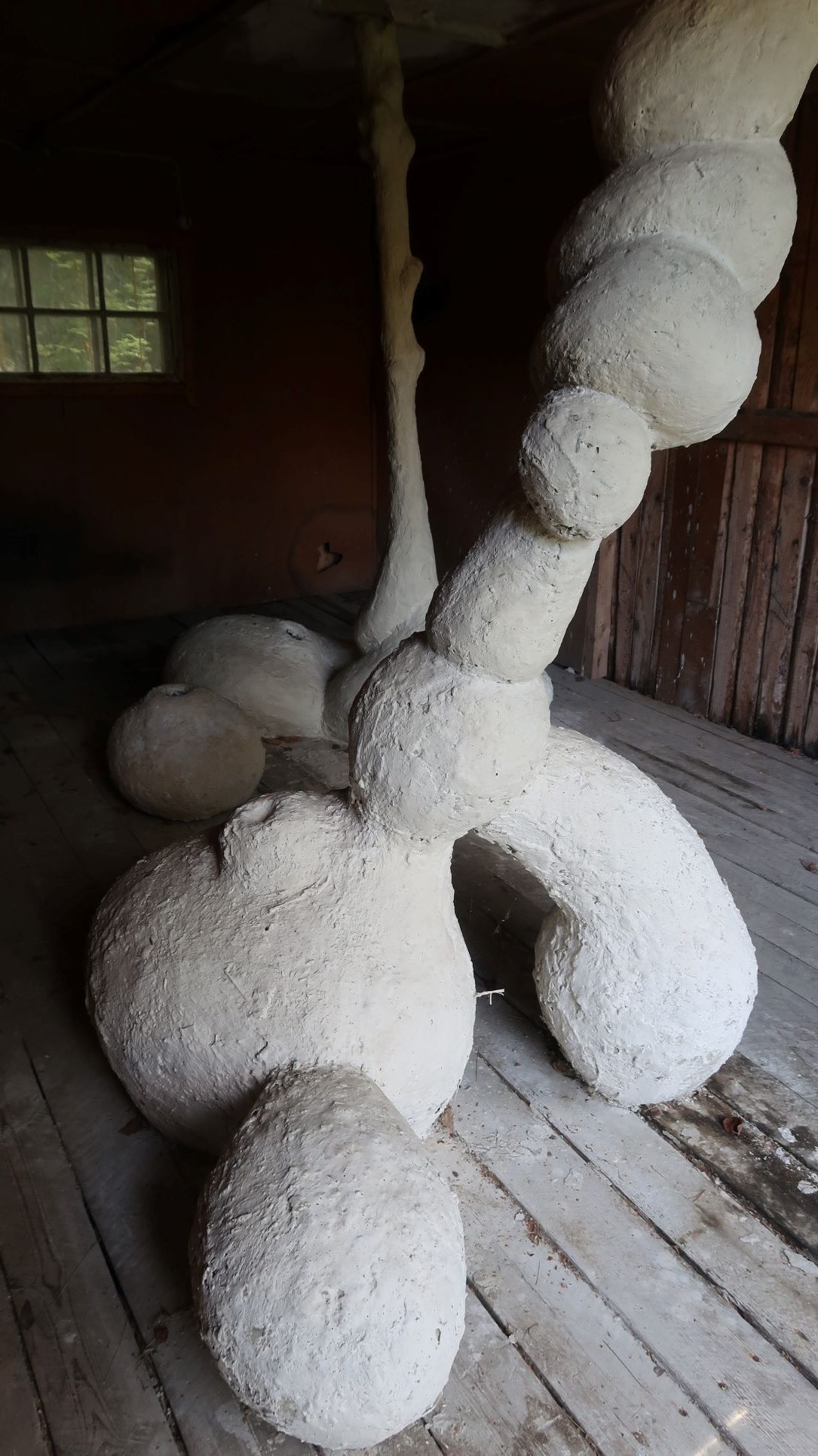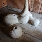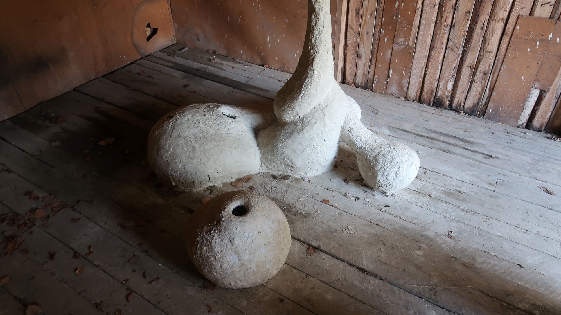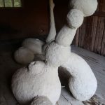 A garage has been built to shelter a car. It is the right size for it. All of the car doors can be opened inside the garage and the height enables people in most cases to walk upright into the garage and to step in or out of the vehicle. The garage doors have been made to measure so the car can easily be driven in and out. There is a small window on the back wall, even though the car does not really need light while inside. There is no heating but the main thing for the car is to be sheltered from snow, rain, wind and the scorching sun. The shed is provided with electricity. The car can thus be heated in the colder winter months. For the last few years the shed has served as a storage space for various things. I don’t know what happened to the car. Perhaps it has grown in size with modern progress so it no longer fits in the old shed or perhaps the owners have left and taken the car with them. Or maybe the car has been sold, scrapped or it is trying to disintegrate as best it can somewhere. This spring the garage was emptied of all the things that have been stored there. They were brought some place, I don’t know where. After the clear-out a clay creation has arrived, or perhaps grown there or been built in the shed. There is some straw or hay sticking out of its pale surface. I don’t know for sure what it is. Perhaps it’s a nest or a hide. Sometimes I wonder if it is a living creature and not just something someone lives in. However I feel that somehow the garage has not fulfilled the needs for the newcomer. Surely it offers the same things as for the car; a shelter from rain, snow, wind and sun, but perhaps they/it need something else as well.